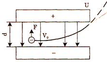 За счет действия силы F возникает вертикальная составляющая скорости электронов, которая будет все время увеличиваться. Начальная скорость электрона V0 остается постоянной, в результате чего траектория движения электронов будет представлять собой параболу.