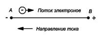 Если в точке А - избыток электронов в сравнении с точкой В (Рис. 1.2), то говорят, что между точками А и В существует разность потенциалов,или напряжение. Если соединить точки А и В каким-либо проводником, например простой проволокой, то избыточные электроны из точки А начнут перетекать в точку В. Этот поток электронов называется электрическим током.