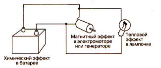 Рис.1.6. Лампа, электромотор и батарея - тепловое, магнитное и химическое действие тока