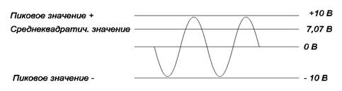 Среднеквадратическое значение сигнала переменного тока зависит от его формы. Так, среднеквадратическое значение синусоидального сигнала составляет 0,707 его пикового значения (амплитуды). Это справедливо только для синусоидального сигнала. Например, если амплитуда синусоидального сигналаU= 10 В, то его среднеквадратическое значение составит Iср.кв = 0,707 ×Um = 0,707 × 10 = 7,07 В Из соотношения Ucp.KB. = 0,707 ×Um, Um = 1/0,707 = 1,414 Ucp.KB