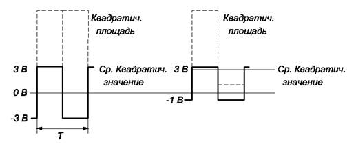 Как видим, прямоугольный сигнал имеет большее среднеквадратическое значение. Это объясняется тем, что площадь под прямоугольной огибающей больше, чем площадь под синусоидой, хотя оба сигнала имеют одинаковые значения положительного и отрицательного пиков. В данном случае среднеквадратическое значение прямоугольного сигнала равно его пиковому значению.