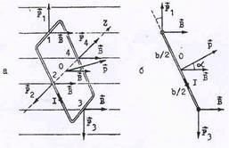 Пусть прямоугольная рамка, со сторонами a и b, обтекаемая током I, помещена в однородное магнитное поле индукции В, как показано на рис.25. Модули сил, действующих