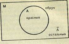 Отвлечемся теперь от описанной конкретной игры и рассмотрим рисунок 1 как изображение некоторого множества М (с помощью множества точек внутри прямоугольника) и некоторого подмножества А (с помощью множества точек круга), выделенного из М некоторым свойством Р, т. е. Л = {*£М|Р (х)}. Оставшиеся элементы М, т. е. те, которые не принадлежат А, не обладают свойством Р. Множество всех этих элементов (тоже подмножество М) называется дополнением множества А (до универсального множества М) и обозначается через А (А с чертой). Если множество А характеризуется свойством Р, то его дополнение А характеризуется свойством не Р (если элементы А красные, то элементы А некрасные). Отрицание предложения Р (х), т. е. предложение « не обладает свойством Р», или «неверно, что х обладает свойством Р», обозначается символом «ПР(л:)». Таким образом, А—[х£М\~\Р{х)\,