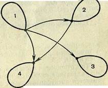 Это отношение обладает таким свойством: каждый элемент множества А находится в этом отношении с самим собой, все пары типа (х, х)— (1, Г), (2, 2), (3, 3), (4, 4) —принадлежат графику этого отношения. Это свойство отражается в графе (рис. 7) тем, что в каждой вершине графа имеется петля, указывающая на то, что каждая точка находится в этом отношении сама с собой. Отношение же «меньше» (рис. 6) не обладает этим свойством, более того, ни один элемент множества не находится в. этом отношении «меньше» с самим собой (ни одно число не меньше самого -себя). Ни в одной вершине этих графов нет петли.