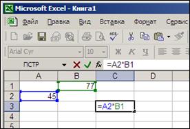 Например. Пусть в ячейке D3 нужно получить произведение чисел, находящихся в ячейках А2 (второй ряд, первая колонка) и B1 (первый ряд, вторая колонка). Это может быть записано одним из следующих способов: