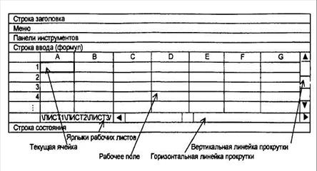 • рабочее поле — фрагмент текущего рабочего листа с ячейками ЭТ, ограниченный слева и сверху рамками с нанесенными на них номерами строк и именами столбцов;