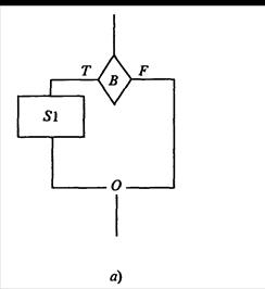 Изображены следующие блок-схемы: а -композиция, или следование; б -альтернатива, илиразвилка, в иг - блок-схемы, каждую из которых называютитерацией, илициклом (с предусловием (в), с постусловием (г)). S1 и S2 представляют собой в общем случае некоторые серии команд для соответствующего исполнителя, В - это условие, в зависимости от истинности (Т) или ложности (F) которого управление передаётся по одной из двух ветвей. Можно доказать, что для составления любого алгоритма достаточно представленных выше четырех блок-схем, если пользоваться их последовательностями и/или суперпозициями.