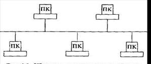 Сеть шинной топологии использует один канал связи (шину), объединяющий все компьютеры сети. Данные, переданные одним узлом сети, поступают во все узлы, но только один из них, для которого предназначены эти данные, распознает и принимает их.