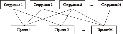 Концепция сетевой модели данных связана с именем Ч. Бахмана. Сетевой подход к организации данных является расширением иерархического. В иерархических структурах запись-потомок должна иметь в точности одного предка; в сетевой структуре данных потомок может иметь любое число предков (рис. 2.2). В ней элемент может быть связан с любым другим, без каких-либо ограничений. Сетевая БД состоит из набора записей, соответствующих каждому экземпляру объекта предметной области и набора связей между ними. Так, например, информация об участии сотрудников в проектах организации может быть представлена в сетевой БД (рис. 2.3). В данном примере сетевая модель хорошо отражает то, что в проекте могут участвовать разные сотрудники, и в то же время сотрудник может участвовать в различных проектах.