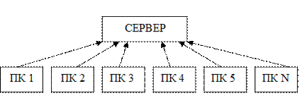 • иерархические сети(рис. 11.2) – это сети, в которых имеется мощный компьютер – выделенный сервер, ресурсы которого предоставляются другим соединенным с ним компьютерам – рабочим станциям. Ресурсы рабочих станций серверу, как правило, недоступны. Иерархические сети организуются при большом количестве рабочих станций. В сравнении с одноранговыми сетями они обеспечивают более высокое быстродействие и надежность работы сети, повышают конфиденциальность и надежность хранения информации и др.