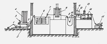 1- сурет. Рубероид өндіретін машинаның схемасы: 4-картон бомбинала-ры (картон оралатын біліктер); 2-таратқыш станок; 3-көптіргіш станок; 4-дайындалған картон қоры; 5-көптіргіш цилиндрлер; 6-сініргіш ванна; 7-, 10 -сыккыш біліктер; 8-косымша сіңіргіш камера; 9-жапқыш ванна; 11-13-сепкіш бункерлер (себінді материалдар қоймалары); 14-суытқыш барабандар; 15-орағыш станок.
