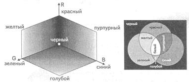 Цветовая модель RGВ является аддитивной, то есть любой цвет представляет собой сочетание в различной пропорции трех основных цветов — красного (Rеd), зеленого (Grееп), синего (В1ие). Она служит основой при создании и обработке компьютерной графики, предназначенной для электронного воспроизведения (на мониторе, телевизоре). При наложении одного компонента основного цвета на другой яркость суммарного излучения увеличивается. Совмещение трех компонентов одинаковой яркости дает ахроматический серый цвет, который при увеличении яркости приближается к белому цвету. При 256 градационных уровнях тона черному цвету соответствуют нулевые значения RGВ, а белому — максимальные, с координатами (255, 255, 255).