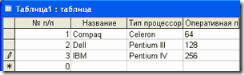 Столбцы такой таблицы называют полями; каждое поле характеризуется своим именем (названием соответствующего свойства) и типом данных, отражающих значения данного свойства. Поля Название и Тип процессора — текстовые, а Оперативная память — числовое. При этом каждое поле обладает определенным набором свойств (размер, формат и др.). Так, для поля Оперативная память задан формат данных целое число.