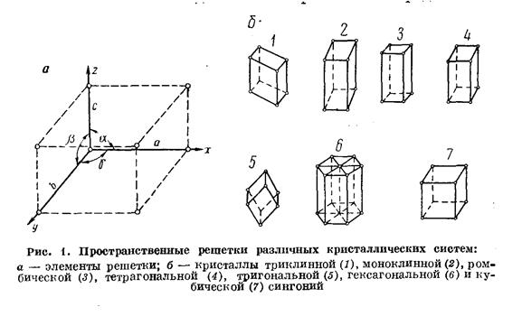 Минералы имеют свою пространственную решетку, соответствующую закону распределения вещества внутри кристалла. Известно семь типов (сингоний) кристаллических решеток, характеризуемых отношениями размеров кристаллических осей a, b, c (наименьших расстояний между узлами решетки в трех направлениях) и углами между ними α, β, γ (рис. 1):