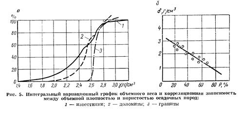 Для более полной характеристики изменчивости параметров пород пользуются вариационными кривыми, которые строят по данным большого числа измерений. По оси абсцисс откладывают численные значения параметра, а по оси ординат — число образцов (в %) со значениями параметра, меньшими или равными данному (рис. 5, а).