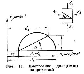 , можно воспользоваться графическим методом с помощью кругов напряжений Мора, которые строятся следующим образом (рис. 11): на оси абсцисс откладывают максимальное и минимальное значения нормальных напряжений, действующих на образец; на разности отрезков, как на диаметре, строится полуокружность.