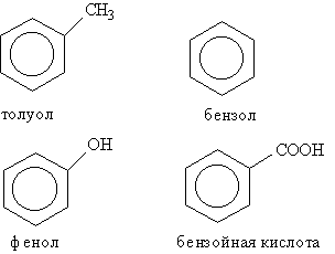 В группе циклических углеводородов особо выделяются ароматические углеводороды, для которых характерно наличие в молекуле бензольного кольца. Некоторые широко известные представители ароматических углеводородов иих производных имеют тривиальные названия, использование которых разрешено правилами ИЮПАК: бензол, толуол, фенол, бензойная кислота.