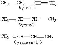 Составление названия органического соединения. Основу названия соединения составляет корень слова, обозначающий предельный углеводород с тем же числом атомов, что и главная цепь (мет-, эт-, проп-, бут-, пент: гекс- и т. д.). Затем следует суффикс, характеризующий степень насыщенности, -ан, если в молекуле нет кратных связей, -ен при наличии двойных связей и -индля тройных связей, (например пентан, пентен, пентин). Если кратных связей в молекуле несколько, то в суффиксе указывается число таких связей: -диен, -триен, а после суффикса обязательно арабскими цифрами указывается положение кратной связи (например, бутен-1, бутен-2, бутадиен-1,3):