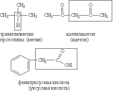 Рациональная номенклатура позволяет строить название вещества на основании его структуры с более простым соединением, выбранным в качестве прототипа. Способ такого построения иллюстрируют следующие примеры: