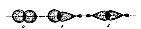 других электронов (p- электроны) имеют форму объемных восьмерок (гантелей) с "перетяжкой" в области ядра и ориентированных в трех взаимно перпендикулярных направлениях (p- состояния электрона).