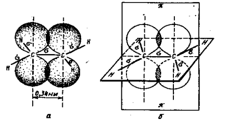 Рис. 5. Перекрывание двух негибридизованных 2р-обриталей в молекуле этилена: а- объемное изображение перекрывающихся негибридизованных 2р-орбиталей; б- схематическое изображение этих орбиталей на плоскости.