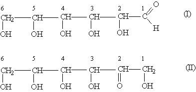Моносахариды — дифункциональные соединения, так как в составе каждой молекулы содержатся несколько гидроксильных групп и одна карбонильная. В зависимости от природы карбонильной группы (альдегидная или кетонная) моносахариды делятся на альдозы и кетозы. Так, моносахарид гексоза существует в виде двух структурных изомеров — альдогексозы (I) (глюкоза) и кетогексозы (II) (фруктоза):