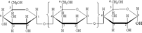 Амилозапредставляет собой линейный биополимер, состоящий из остатков глюкозы, соединенных через кислородные атомы в положении 1 и 4. Молекулярная масса амилозы от 150 000 до 500 000 а. е. м. в зависимости от вида растения.