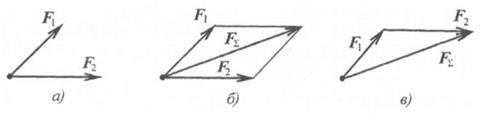 Равнодействующую двух пересекающихся сил можно определить с помощью параллелограмма или треугольника сил (4-я аксиома) (рис. 1.13).
