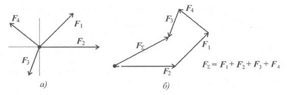 Используя свойства векторной суммы сил, можно получить равнодействующую любой сходящейся системы сил, складывая последовательно силы, входящие в систему. Образуется многоугольник сил (рис. 1.13). Вектор равнодействующей силы соединит начало первого вектора с концом последнего.
