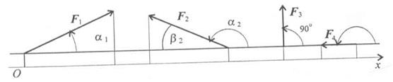 F1x = F1 cos α1 > 0; F2x = F2 cos α2 = - F2 cos β2;