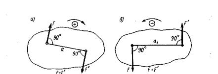 Момент силы пары сил считается положительным, если пара стремиться повернуть тело по направлению хода часовой стрелки (рис. 1.20 а), и отрицательным, если пара сил стремиться вращать тело против часовой стрелки (рис. 1.20 б).