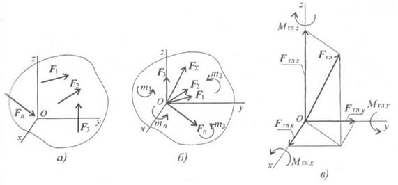 Дана пространственная система сил (рис. 7.5а). Приведем ее к центру О.