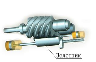 Верхняя часть золотника повторяет профиль внутренней поверхности корпуса. Золотник, перемещаясь параллельно оси роторов, уменьшает или увеличивает объем полости сжатия.