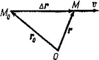 Пусть точка М произвольно движется по некоторой кривой. Пусть в момент t точка занимает положение М, а через весьма малый промежуток времени Δt она занимает положение М1. Положение точки М определяется радиусом-вектором г, а положение точки М1 — радиусом-вектором г+Δг, равномерное прямолинейное движение точки из М в М^ можно охарактеризовать скоростью, равной отношению Δг к Δt, называемой средней скоростью: