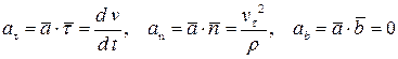 Из изложенного выше следует, что вектор ускорения располагается в соприкасающейся плоскости и направлен в сторону вогнутости траектории. Проекции вектора ускорения на естественные оси равны:
