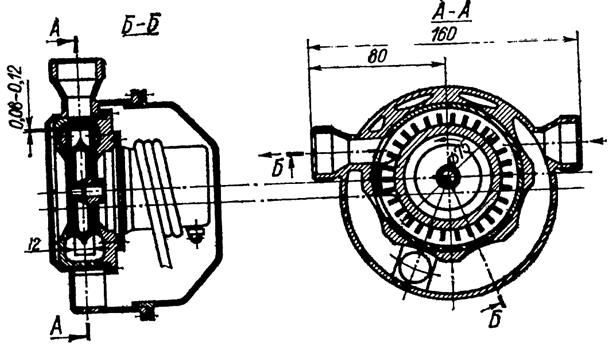 На рисунке 60 изображен двухступенчатый вихревой компрессор ВК-11 с прямоугольной формой меридионального сечения переферийно-бокового канала. Компрессор предназначен для компримирования высококонцентрационного фтора; при производительности 0,5-1