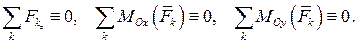 Таким образом, для равновесия произвольной пространственной системы сил необходимо и достаточно, чтобы равнялись нулю суммы проекций всех сил на выбранные координатные оси и суммы моментов всех сил относительно этих осей.