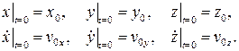 Для нахождения уравнений движения точки нужно дважды проинтегрировать эти уравнения. Как известно, при интегрировании дифференциального уравнения второго порядка, решение содержит две константы интегрирования, т.е. для случая трех уравнений имеется шесть произвольных постоянных. Подставляя найденные значения констант интегрирования в общее решение дифференциальных уравнений движения, получим частные решения, справедливые для данных в задаче начальных условий:
