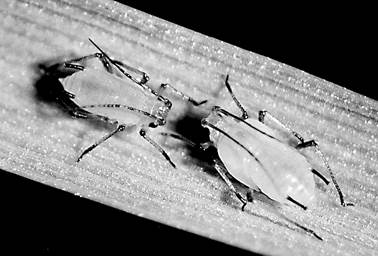 Большая злаковая тля (Sitobion avenae F.) – представитель семейства настоящих тлей. Это – насекомое с неполным превращением и со сложным циклом развития. Взрослая тля имеет веретеновидное тело, длиной 2,5-3,2 мм, желтовато–зеленой окраски с длинными ногами. Усики насекомого длиннее тела. Личинка имагообразная. Крылатые самки имеют черновато-бурую грудь и зеленое брюшко. Вредоносные фазы – личинка и имаго. Вредитель распространен повсеместно, питаясь соками листьев, вредит на посевах зерновых культур, кроме кукурузы и проса (рис. 2).