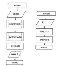 Задача: Определить площадь кругового кольца с заданным внешним R1 и внутренним R2 радиусами, используя подпрограмму вычисления площади круга.
