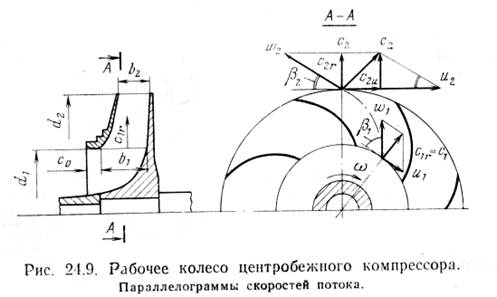 Рабочее колесо состоит из переднего и заднего дисков и размещенных между ними лопаток постоянной толщины (см. рис. 9). Такое рабочее колесо называется закрытым в отличие от полуоткрытого колеса без переднего диска, у которого лопатки отлиты или выфрезерованы за одно целое с основным диском. Рабочее колесо закрытого типа применяется при умеренных окружных скоростях (и2<300 м/с), что обеспечивает степень повышения давления pк не более 1,5—1,7. Полуоткрытые колеса ввиду сложности их изготовления применяются лишь в специальных компрессорах (авиационных нагнетателях). Они позволяют работать при больших и2=400—500 м/с, поэтому в них pк =4,0—4,5.