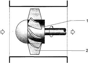 Основной конструктивный элемент — вращающийся ротор 1, на поверхности которого укреплены рабочие лопатки 2