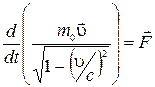 — сила, действующая на частицу. Данное уравнение по виду полностью совпадает с основным уравнением ньютоновской динамики. Однако физический смысл здесь уже другой: слева стоит производная по времени от релятивистского импульса, определяемого формулой (1.10.9). Подставив (1.10.9) в (1.10.10), получим