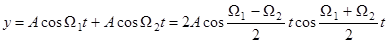. Такие движения называются биениями. Рассмотрим сумму двух колебаний с одинаковыми ампли-тудами с близкими частотами и нулевыми начальными фазами: