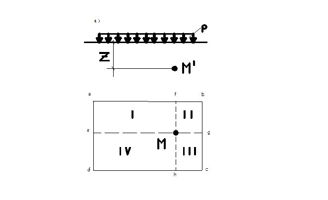 Действительно, если проекция рассматриваемой точки М' на горизонтальную поверхность полупространства (точка М) располагается в пределах площади загружения (Рисунок 13, а), то эту площадь можно разбить на четыре прямоугольника (I – Мeaf, II – Mfbg, III – Mgch, IV - Mhde) таким образом, чтобы точка М являлась угловой точкой каждого из них. Тогда напряжение σ z найдем суммированием напряжений под угловыми точками четырех площадей загружения: