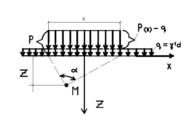 В основании выбирают некоторую точку М. В этой точке определяют контактное напряжение р, при котором в этой точке возникнет предельное напряженное состояние. Полное напряжение в точкеМ- сумма напряжений от собственного веса грунта, лежащего выше этой точки, и от местной дополнительной нагрузки интенсивностью р – q.
