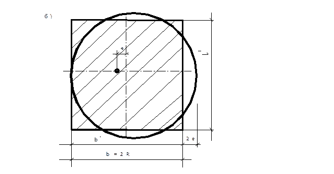 eb и el - соответственно эксцентриситеты приложения равнодействующей нагрузок в уровне подошвы фундамента, причем символом b обозначена сторона фундамента, в направлении которой ожидается потеря устойчивости основания. Правила определения величин b'и l'для прямоугольного и круглого фундаментов показаны на рисунке 20.