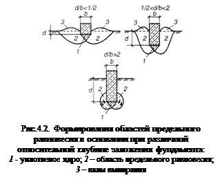В зависимости от глубины заложения подошвы фундамента d/b очертания областей предельного равновесия имеют различный характер (рис. 4.2).