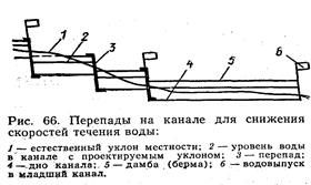 Скорость движения воды в каналах при больших уклонах местности по трассе каналов регулируют специальными сооружениями — перепадами и быстротоками (рис. 66). С помощью перепадов создают участки каналов с уменьшенными против естественных уклонами, не превышающих допустимые, а быстротоки увеличивают допустимую не-размывающую скорость течения воды в канале. Для сопряжения ороси-, тельных каналов со сбросными применяют иногда консольные быстротоки.