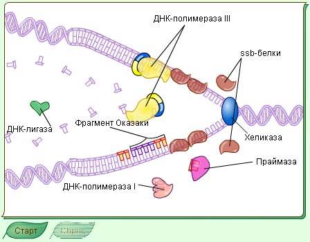 Рис.1-3. Репликация у прокариот на примере E. coli и участие в ней ферментов. Образование полуконсервативных "дочерних" молекул ДНК в результате репликации. Синтез "дочерних" цепей идёт в направлении от 5' к 3' комплементарно и антипараллельно цепям "материнской" молекулы